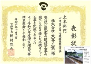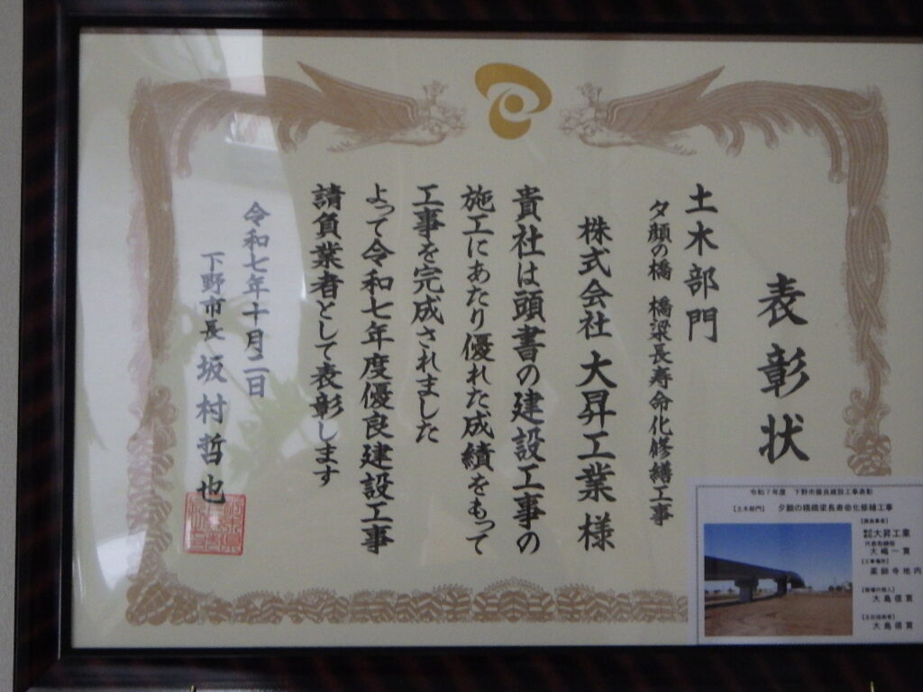 令和7年度 下野市表彰 2025年11月13日 最終更新日時 : 2025年11月13日 daisyo ・夕顔の橋橋梁長寿命化修繕工事 下野市 薬師寺 地内 工期 2023.11.15~2024.5.23 2025.10.2 令和7年度優良建設工事請負業者 土木部門 にて下野市長より表彰をされました。 共有: Facebook で共有するにはクリックしてください (新しいウィンドウで開きます) Facebook